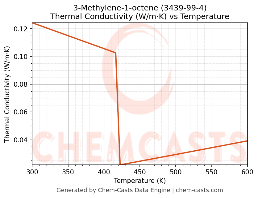 This page presents the temperature-dependent thermodynamic and transport properties of 3-Methylene-1-octene (CAS 3439-99-4) calculated at a constant pressure of 1 atm (101325 Pa) over the temperature range 250-500 K.