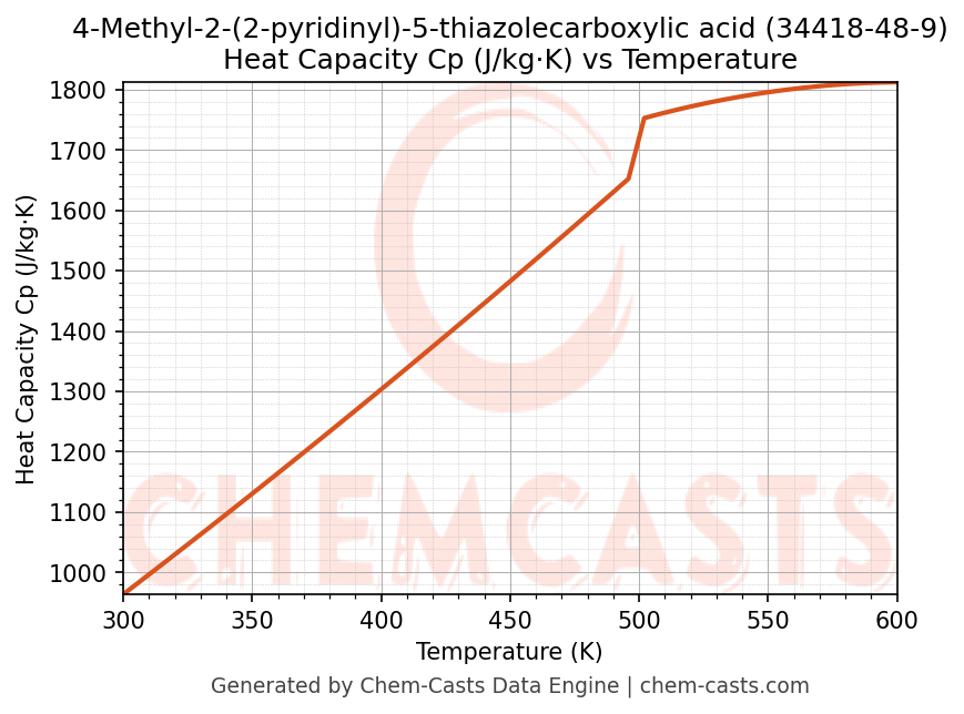 - Specific heat capacity (Cp) indicates the amount of energy required to raise the temperature of 4-Methyl-2-(2-pyridinyl)-5-thiazolecarboxylic acid and is critical for energy balance and heat-exchanger design.