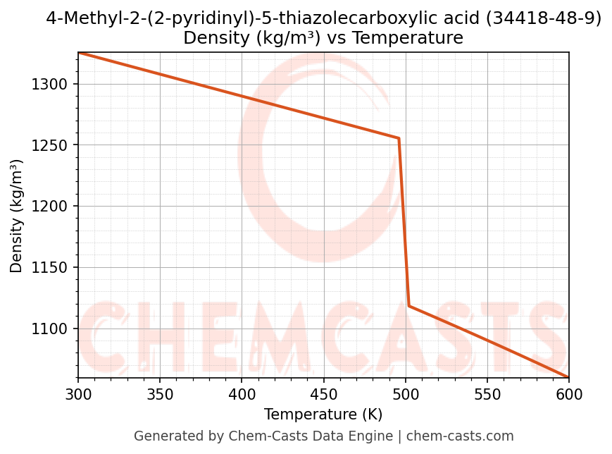 This page presents the temperature-dependent thermodynamic and transport properties of 4-Methyl-2-(2-pyridinyl)-5-thiazolecarboxylic acid (CAS 34418-48-9) calculated at a constant pressure of 1 atm (101325 Pa) over the temperature range 250-500 K.
