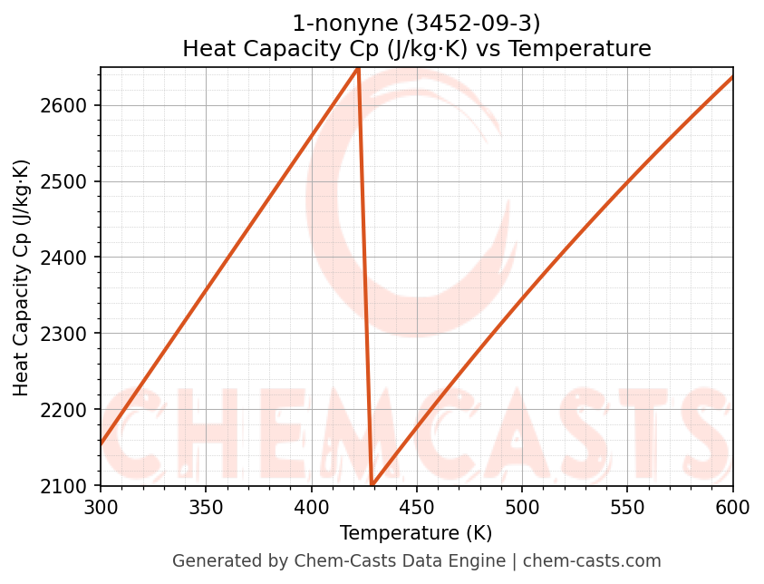 - Specific heat capacity (Cp) indicates the amount of energy required to raise the temperature of 1-nonyne and is critical for energy balance and heat-exchanger design.