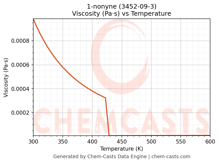 This page presents the temperature-dependent thermodynamic and transport properties of 1-nonyne (CAS 3452-09-3) calculated at a constant pressure of 1 atm (101325 Pa) over the temperature range 250-500 K.
