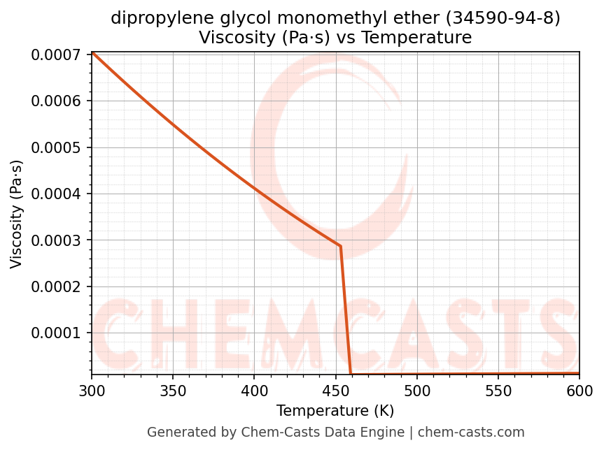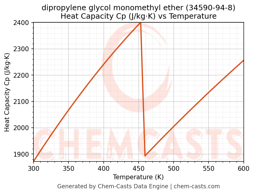 - Specific heat capacity (Cp) indicates the amount of energy required to raise the temperature of dipropylene glycol monomethyl ether and is critical for energy balance and heat-exchanger design.