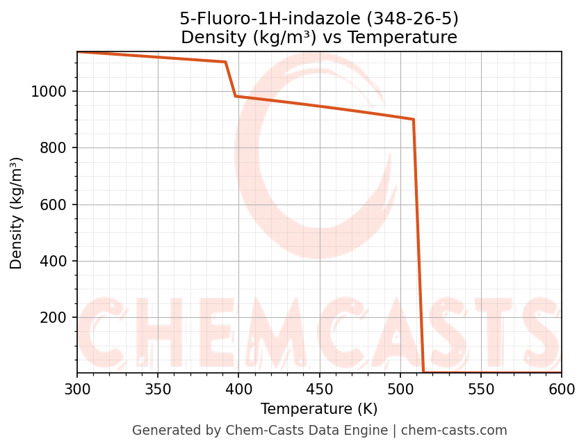 This page presents the temperature-dependent thermodynamic and transport properties of 5-Fluoro-1H-indazole (CAS 348-26-5) calculated at a constant pressure of 1 atm (101325 Pa) over the temperature range 250-500 K.
