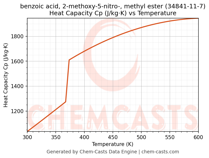 - Specific heat capacity (Cp) indicates the amount of energy required to raise the temperature of benzoic acid, 2-methoxy-5-nitro-, methyl ester and is critical for energy balance and heat-exchanger design.