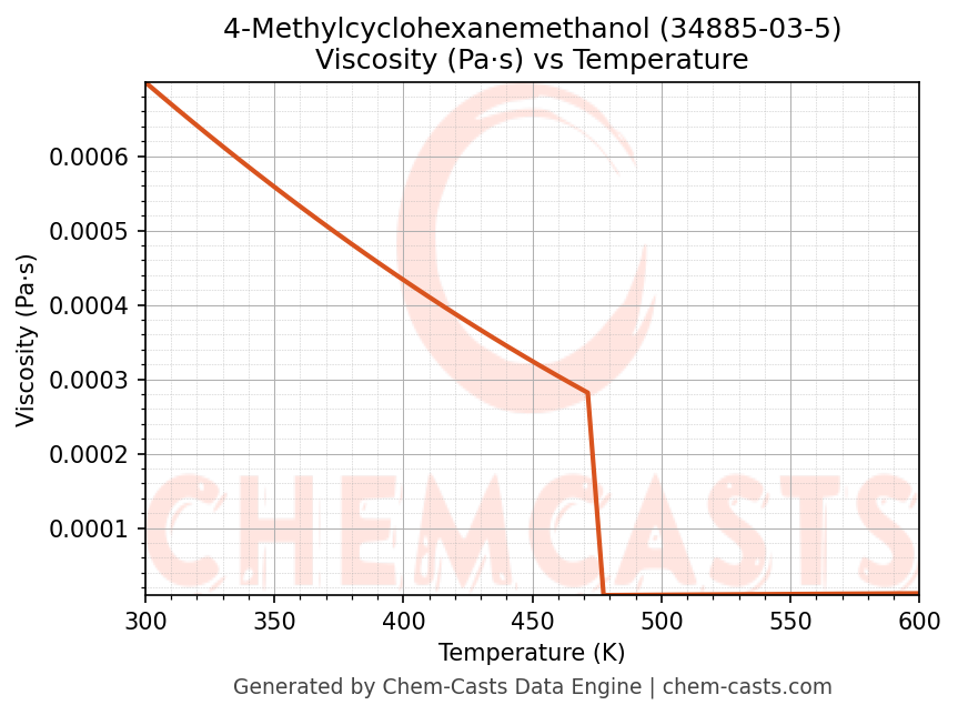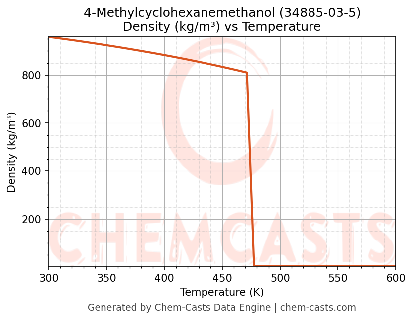 This page presents the temperature-dependent thermodynamic and transport properties of 4-Methylcyclohexanemethanol (CAS 34885-03-5) calculated at a constant pressure of 1 atm (101325 Pa) over the temperature range 250-500 K.