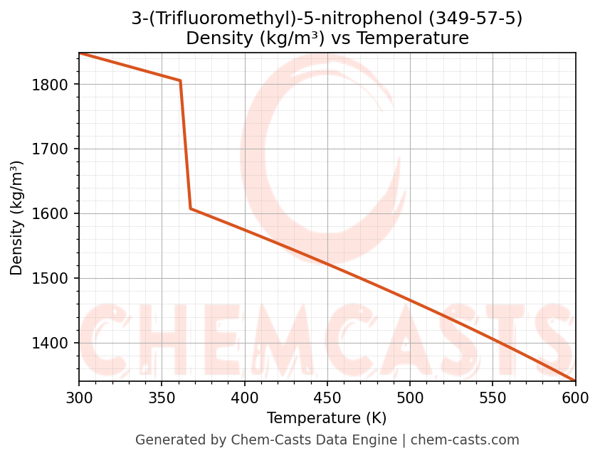 This page presents the temperature-dependent thermodynamic and transport properties of 3-(Trifluoromethyl)-5-nitrophenol (CAS 349-57-5) calculated at a constant pressure of 1 atm (101325 Pa) over the temperature range 250-500 K.