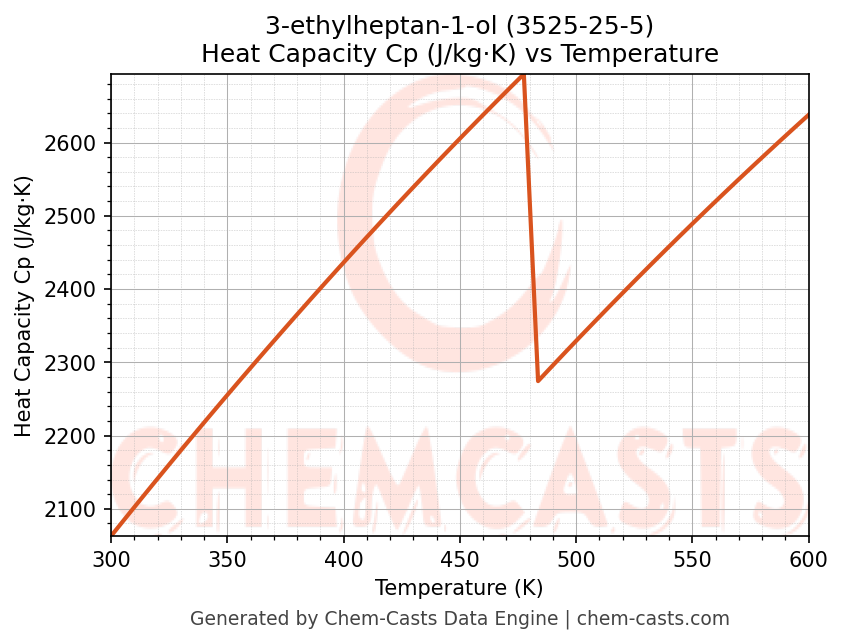 - Specific heat capacity (Cp) indicates the amount of energy required to raise the temperature of 3-ethylheptan-1-ol and is critical for energy balance and heat-exchanger design.