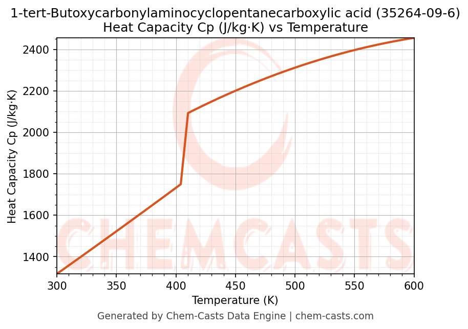 - Specific heat capacity (Cp) indicates the amount of energy required to raise the temperature of 1-tert-Butoxycarbonylaminocyclopentanecarboxylic acid and is critical for energy balance and heat-exchanger design.