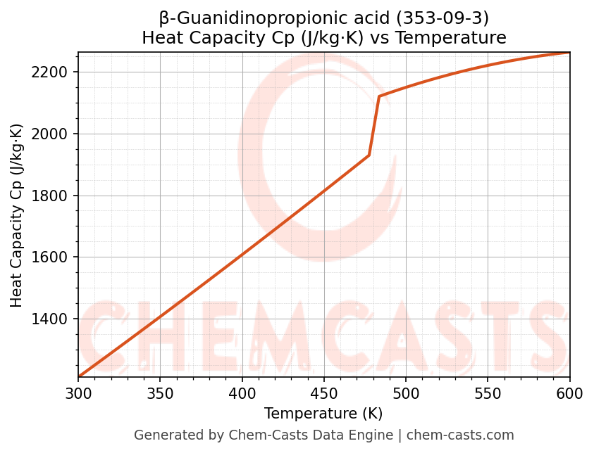 - Specific heat capacity (Cp) indicates the amount of energy required to raise the temperature of β-Guanidinopropionic acid and is critical for energy balance and heat-exchanger design.