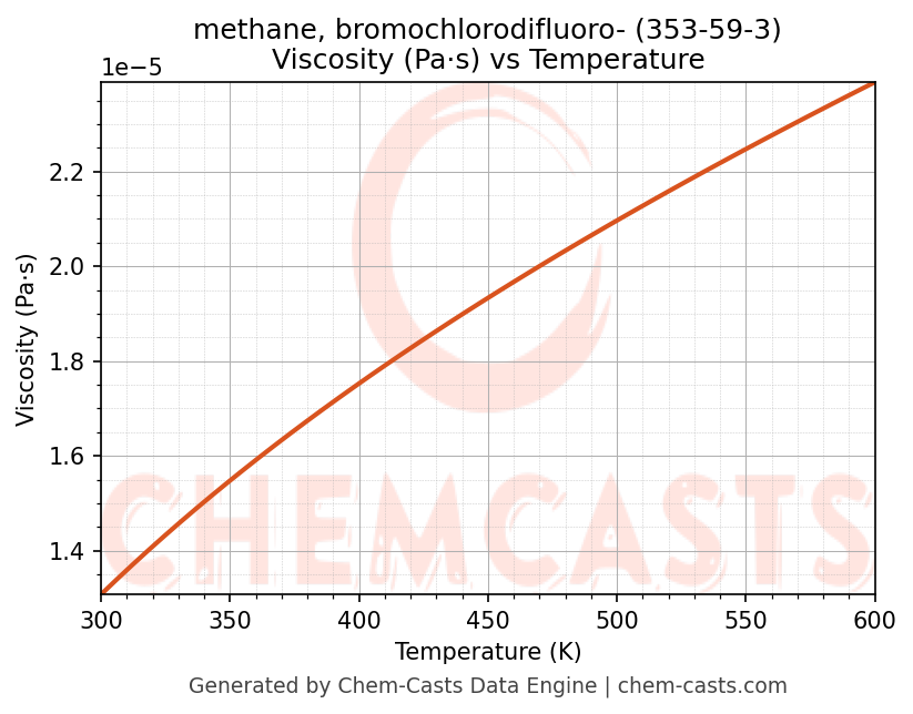 This page presents the temperature-dependent thermodynamic and transport properties of methane, bromochlorodifluoro- (CAS 353-59-3) calculated at a constant pressure of 1 atm (101325 Pa) over the temperature range 250-500 K.