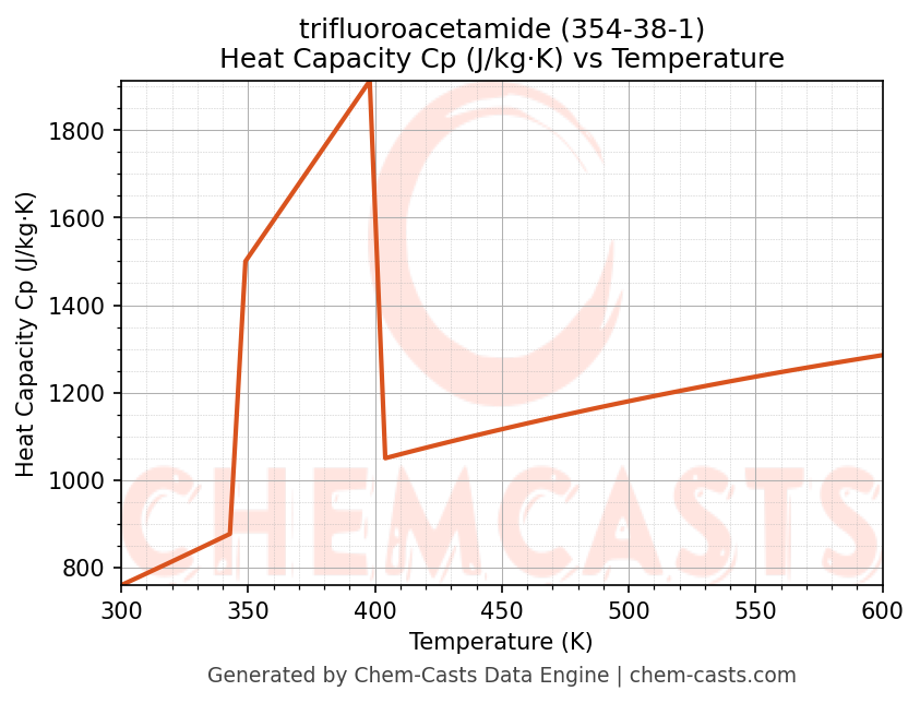 - Specific heat capacity (Cp) indicates the amount of energy required to raise the temperature of trifluoroacetamide and is critical for energy balance and heat-exchanger design.