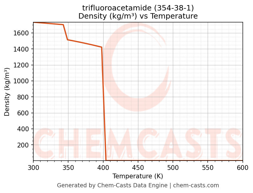 This page presents the temperature-dependent thermodynamic and transport properties of trifluoroacetamide (CAS 354-38-1) calculated at a constant pressure of 1 atm (101325 Pa) over the temperature range 250-500 K.