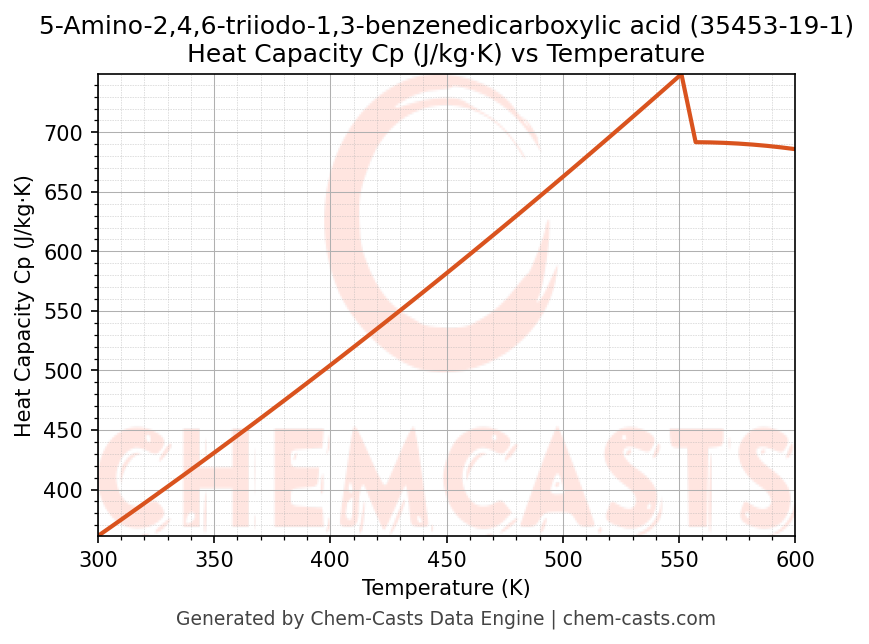 - Specific heat capacity (Cp) indicates the amount of energy required to raise the temperature of 5-Amino-2,4,6-triiodo-1,3-benzenedicarboxylic acid and is critical for energy balance and heat-exchanger design.