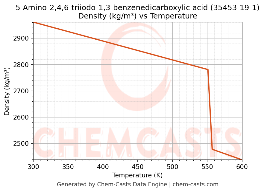 This page presents the temperature-dependent thermodynamic and transport properties of 5-Amino-2,4,6-triiodo-1,3-benzenedicarboxylic acid (CAS 35453-19-1) calculated at a constant pressure of 1 atm (101325 Pa) over the temperature range 250-500 K.