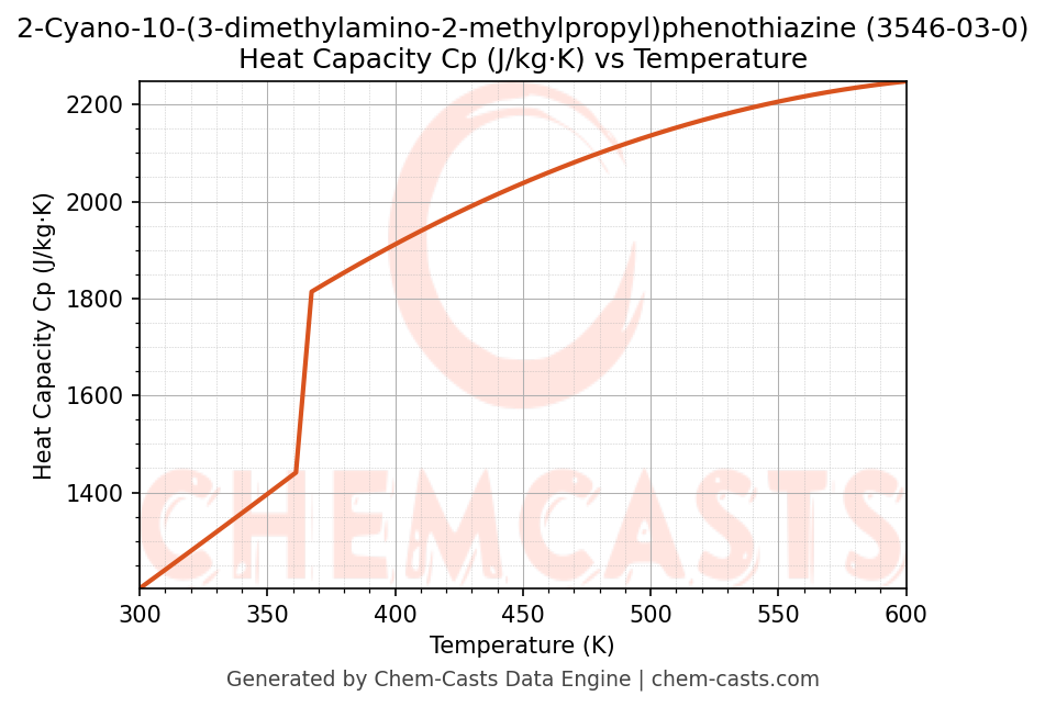- Specific heat capacity (Cp) indicates the amount of energy required to raise the temperature of 2-Cyano-10-(3-dimethylamino-2-methylpropyl)phenothiazine and is critical for energy balance and heat-exchanger design.