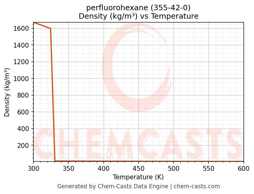 This page presents the temperature-dependent thermodynamic and transport properties of perfluorohexane (CAS 355-42-0) calculated at a constant pressure of 1 atm (101325 Pa) over the temperature range 250-500 K.