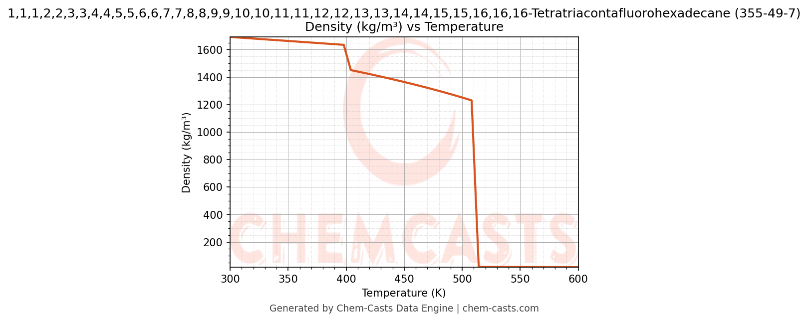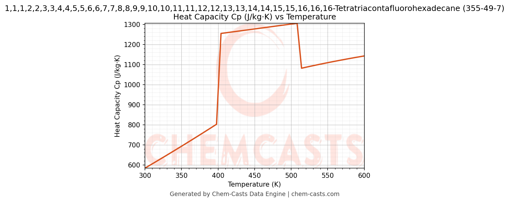 This page presents the temperature-dependent thermodynamic and transport properties of 1,1,1,2,2,3,3,4,4,5,5,6,6,7,7,8,8,9,9,10,10,11,11,12,12,13,13,14,14,15,15,16,16,16-Tetratriacontafluorohexadecane (CAS 355-49-7) calculated at a constant pressure of 1 atm (101325 Pa) over the temperature range 250-500 K.