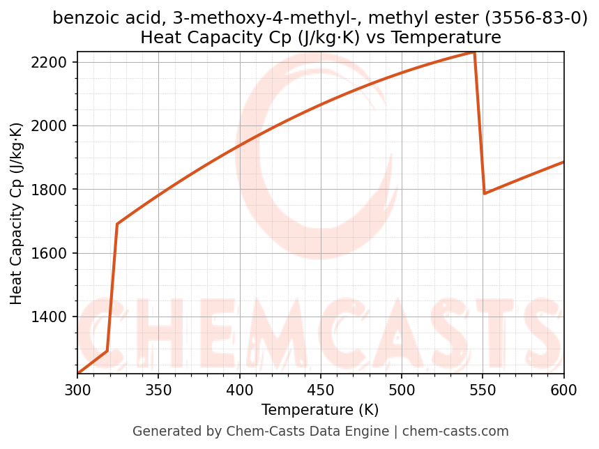 - Specific heat capacity (Cp) indicates the amount of energy required to raise the temperature of benzoic acid, 3-methoxy-4-methyl-, methyl ester and is critical for energy balance and heat-exchanger design.