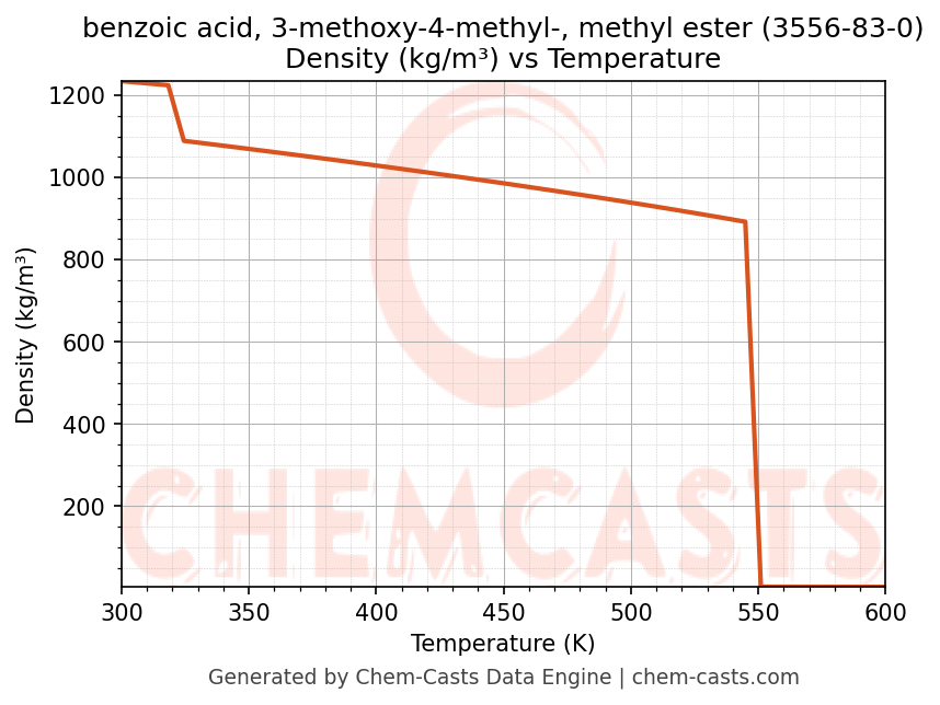 This page presents the temperature-dependent thermodynamic and transport properties of benzoic acid, 3-methoxy-4-methyl-, methyl ester (CAS 3556-83-0) calculated at a constant pressure of 1 atm (101325 Pa) over the temperature range 250-500 K.