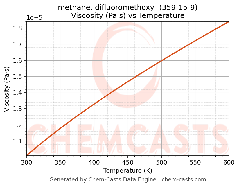 This page presents the temperature-dependent thermodynamic and transport properties of methane, difluoromethoxy- (CAS 359-15-9) calculated at a constant pressure of 1 atm (101325 Pa) over the temperature range 250-500 K.