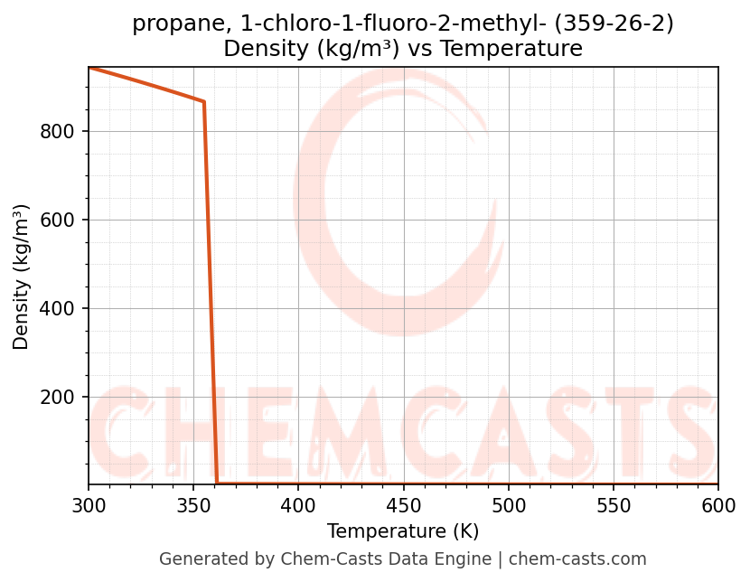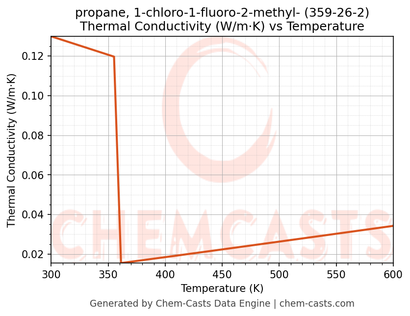 This page presents the temperature-dependent thermodynamic and transport properties of propane, 1-chloro-1-fluoro-2-methyl- (CAS 359-26-2) calculated at a constant pressure of 1 atm (101325 Pa) over the temperature range 250-500 K.