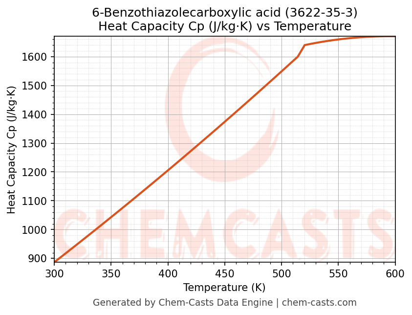 - Specific heat capacity (Cp) indicates the amount of energy required to raise the temperature of 6-Benzothiazolecarboxylic acid and is critical for energy balance and heat-exchanger design.