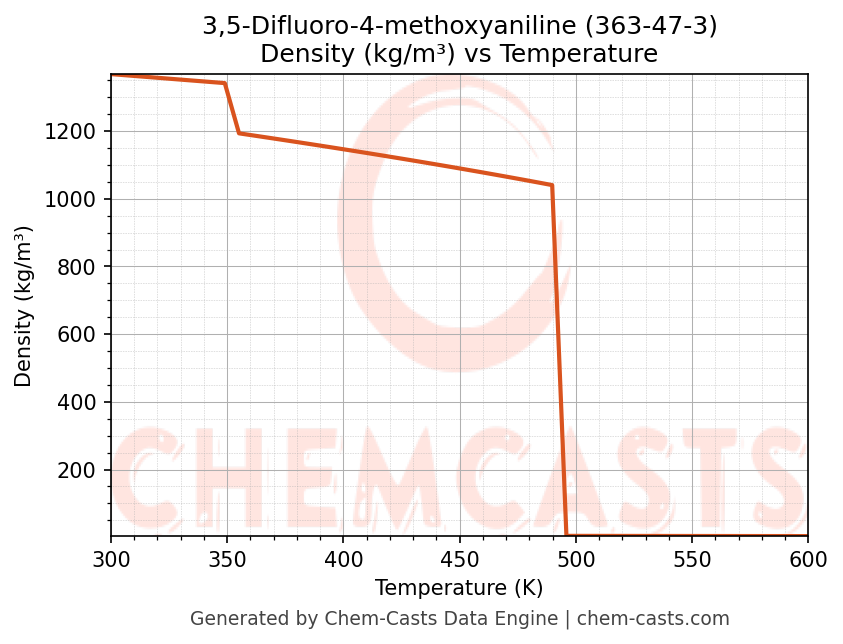 This page presents the temperature-dependent thermodynamic and transport properties of 3,5-Difluoro-4-methoxyaniline (CAS 363-47-3) calculated at a constant pressure of 1 atm (101325 Pa) over the temperature range 250-500 K.