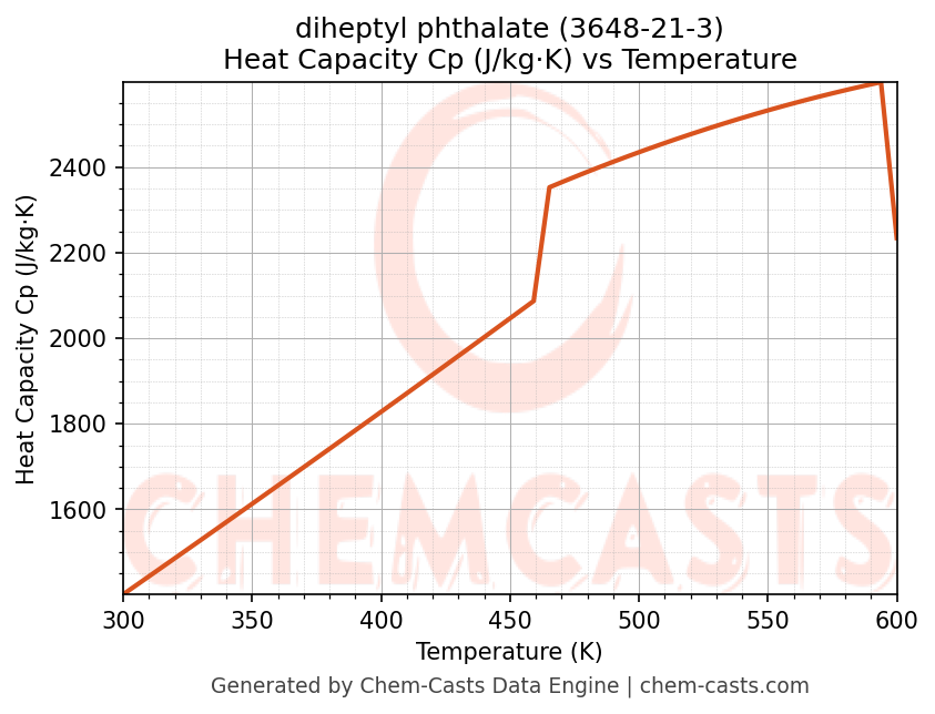 - Specific heat capacity (Cp) indicates the amount of energy required to raise the temperature of diheptyl phthalate and is critical for energy balance and heat-exchanger design.