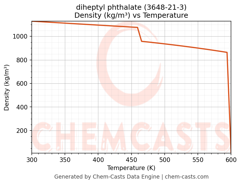 This page presents the temperature-dependent thermodynamic and transport properties of diheptyl phthalate (CAS 3648-21-3) calculated at a constant pressure of 1 atm (101325 Pa) over the temperature range 250-500 K.