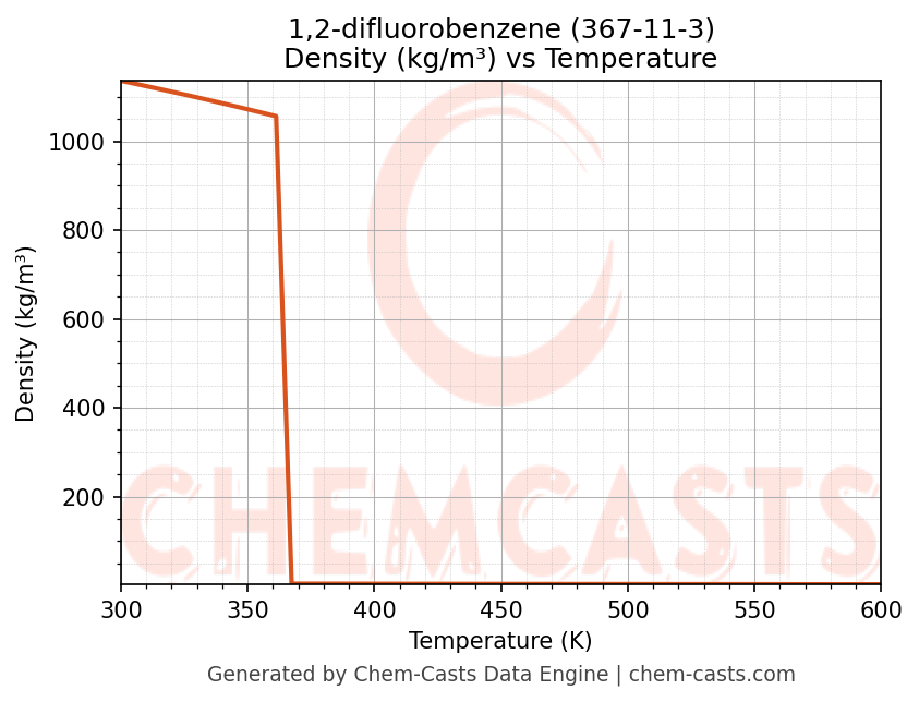 This page presents the temperature-dependent thermodynamic and transport properties of 1,2-difluorobenzene (CAS 367-11-3) calculated at a constant pressure of 1 atm (101325 Pa) over the temperature range 250-500 K.