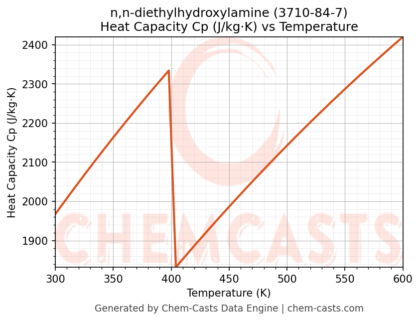 - Specific heat capacity (Cp) indicates the amount of energy required to raise the temperature of n,n-diethylhydroxylamine and is critical for energy balance and heat-exchanger design.