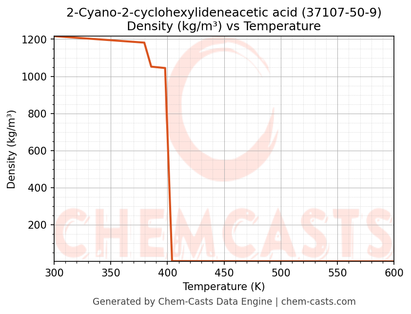 This page presents the temperature-dependent thermodynamic and transport properties of 2-Cyano-2-cyclohexylideneacetic acid (CAS 37107-50-9) calculated at a constant pressure of 1 atm (101325 Pa) over the temperature range 250-500 K.