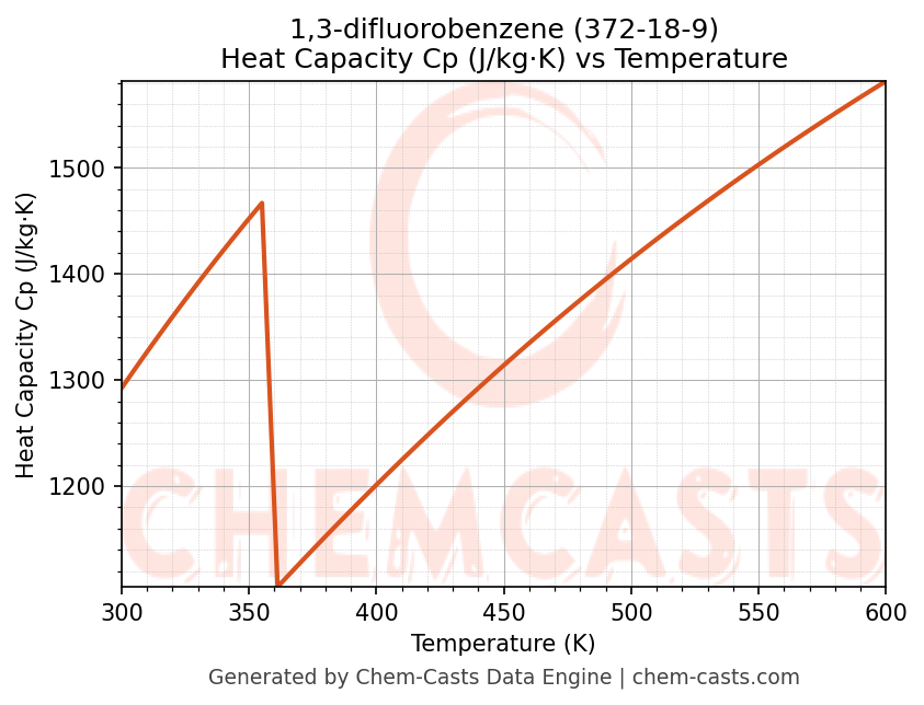 - Specific heat capacity (Cp) indicates the amount of energy required to raise the temperature of 1,3-difluorobenzene and is critical for energy balance and heat-exchanger design.