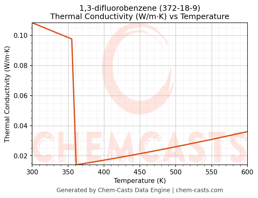 This page presents the temperature-dependent thermodynamic and transport properties of 1,3-difluorobenzene (CAS 372-18-9) calculated at a constant pressure of 1 atm (101325 Pa) over the temperature range 250-500 K.