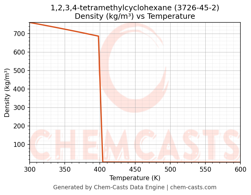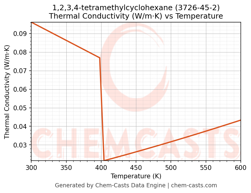 This page presents the temperature-dependent thermodynamic and transport properties of 1,2,3,4-tetramethylcyclohexane (CAS 3726-45-2) calculated at a constant pressure of 1 atm (101325 Pa) over the temperature range 250-500 K.