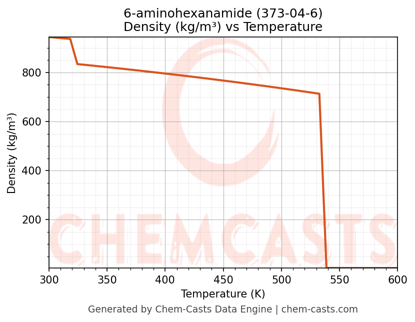This page presents the temperature-dependent thermodynamic and transport properties of 6-aminohexanamide (CAS 373-04-6) calculated at a constant pressure of 1 atm (101325 Pa) over the temperature range 250-500 K.