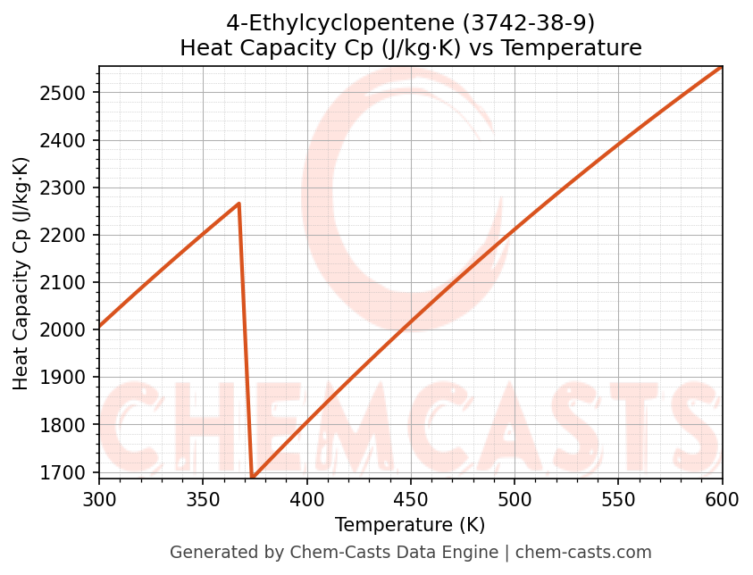 - Specific heat capacity (Cp) indicates the amount of energy required to raise the temperature of 4-Ethylcyclopentene and is critical for energy balance and heat-exchanger design.