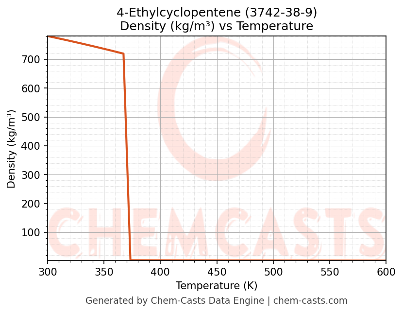 This page presents the temperature-dependent thermodynamic and transport properties of 4-Ethylcyclopentene (CAS 3742-38-9) calculated at a constant pressure of 1 atm (101325 Pa) over the temperature range 250-500 K.