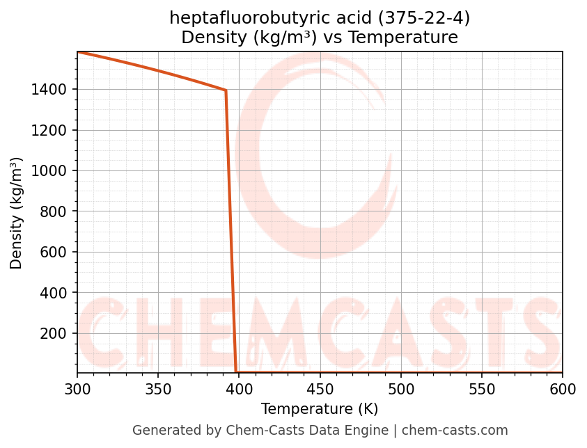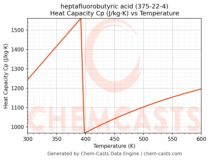 - Specific heat capacity (Cp) indicates the amount of energy required to raise the temperature of heptafluorobutyric acid and is critical for energy balance and heat-exchanger design.