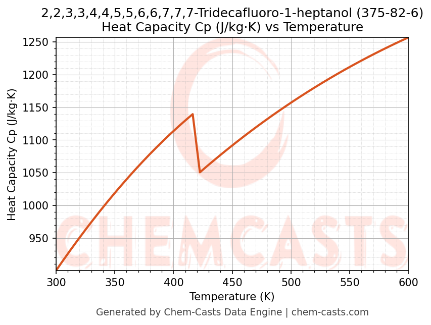 - Specific heat capacity (Cp) indicates the amount of energy required to raise the temperature of 2,2,3,3,4,4,5,5,6,6,7,7,7-Tridecafluoro-1-heptanol and is critical for energy balance and heat-exchanger design.