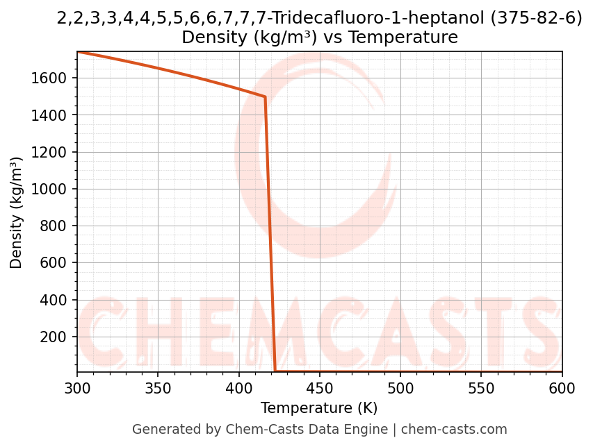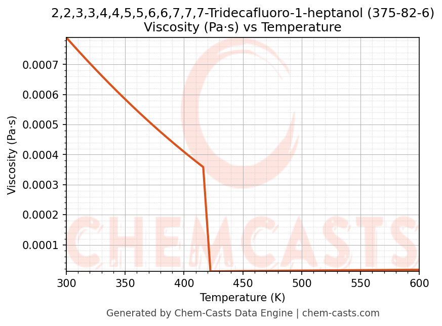 This page presents the temperature-dependent thermodynamic and transport properties of 2,2,3,3,4,4,5,5,6,6,7,7,7-Tridecafluoro-1-heptanol (CAS 375-82-6) calculated at a constant pressure of 1 atm (101325 Pa) over the temperature range 250-500 K.