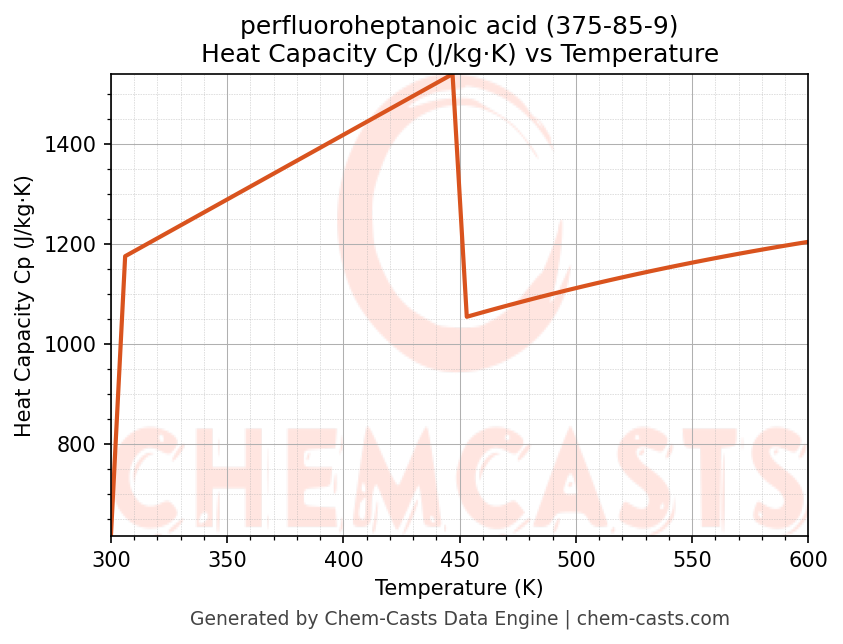 - Specific heat capacity (Cp) indicates the amount of energy required to raise the temperature of perfluoroheptanoic acid and is critical for energy balance and heat-exchanger design.