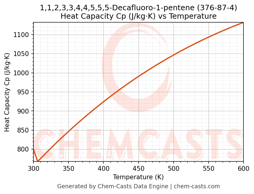 - Specific heat capacity (Cp) indicates the amount of energy required to raise the temperature of 1,1,2,3,3,4,4,5,5,5-Decafluoro-1-pentene and is critical for energy balance and heat-exchanger design.