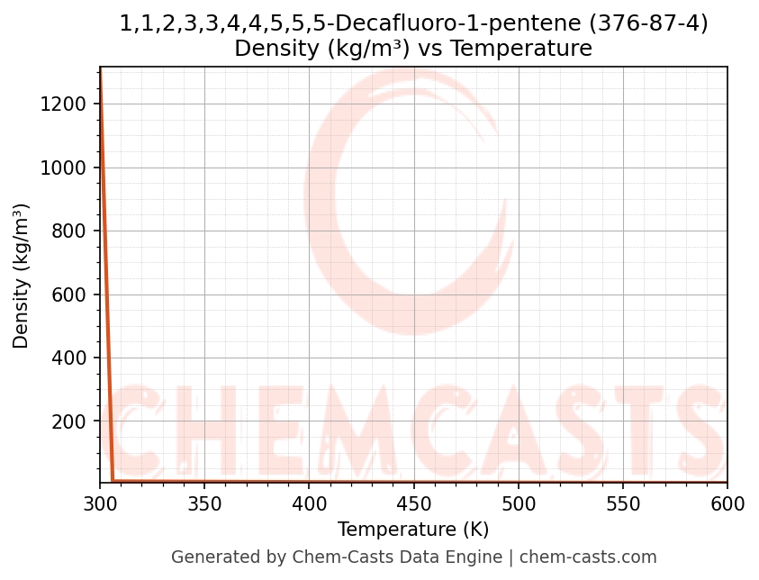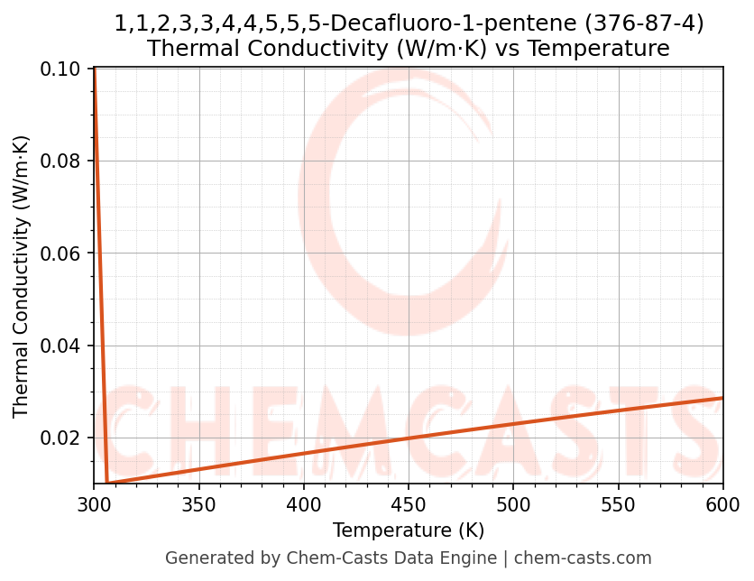 This page presents the temperature-dependent thermodynamic and transport properties of 1,1,2,3,3,4,4,5,5,5-Decafluoro-1-pentene (CAS 376-87-4) calculated at a constant pressure of 1 atm (101325 Pa) over the temperature range 250-500 K.