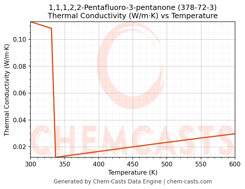 This page presents the temperature-dependent thermodynamic and transport properties of 1,1,1,2,2-Pentafluoro-3-pentanone (CAS 378-72-3) calculated at a constant pressure of 1 atm (101325 Pa) over the temperature range 250-500 K.