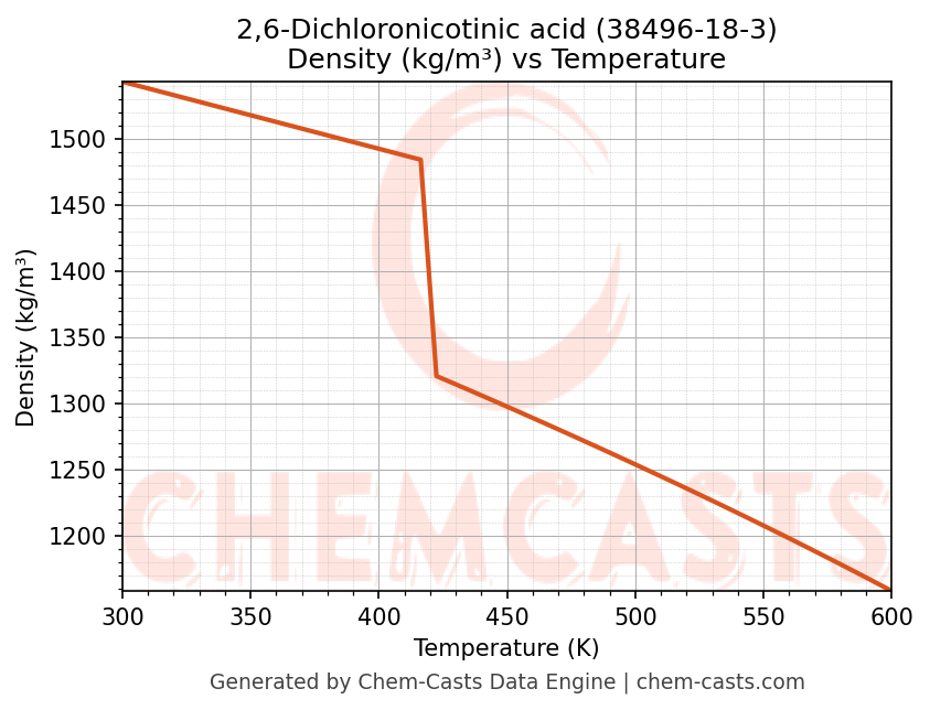 This page presents the temperature-dependent thermodynamic and transport properties of 2,6-Dichloronicotinic acid (CAS 38496-18-3) calculated at a constant pressure of 1 atm (101325 Pa) over the temperature range 250-500 K.