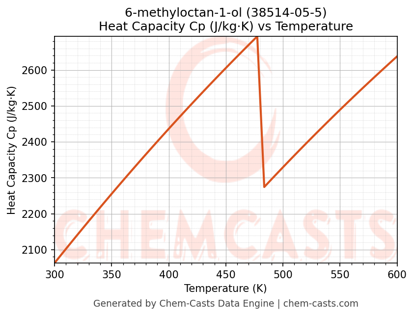 - Specific heat capacity (Cp) indicates the amount of energy required to raise the temperature of 6-methyloctan-1-ol and is critical for energy balance and heat-exchanger design.