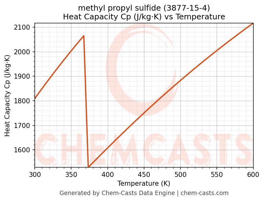 - Specific heat capacity (Cp) indicates the amount of energy required to raise the temperature of methyl propyl sulfide and is critical for energy balance and heat-exchanger design.