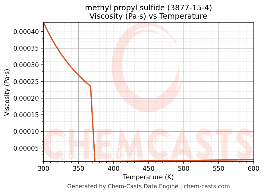 This page presents the temperature-dependent thermodynamic and transport properties of methyl propyl sulfide (CAS 3877-15-4) calculated at a constant pressure of 1 atm (101325 Pa) over the temperature range 250-500 K.