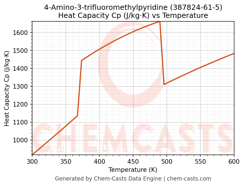 This page presents the temperature-dependent thermodynamic and transport properties of 4-Amino-3-trifluoromethylpyridine (CAS 387824-61-5) calculated at a constant pressure of 1 atm (101325 Pa) over the temperature range 250-500 K.